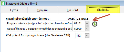 Údaje o firmě (záložka Statistika) – výměna číselníku CZ-NACE za nový číselník CZ-NACE 2025 z důvodu změny na portále Mojedane od 1.1.2026. Údaj v Nastavení je potřeba ručně opravit dle nových kódů. Pokud v nastavení zůstane původní kód CZ-NACE, bude v přiznání DPH hlášena propustná chyba, ale podání lze uskutečnit.